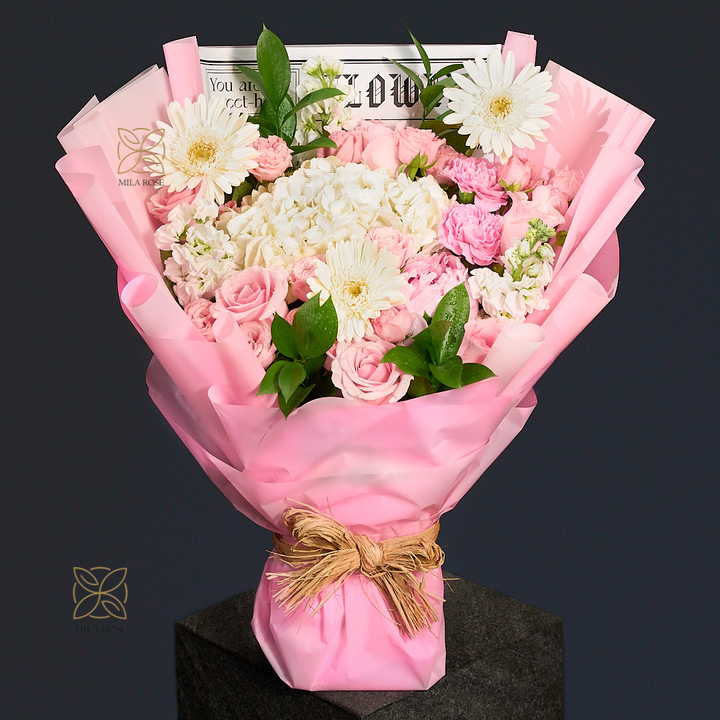 12 roses + 3 matthiola + 3 Hypericum + 2 Gerbera + 4 Ruscus + 1 Hydrangea + 6 carnations – luxury design, soft colors, and a smell that makes her smile 🌸