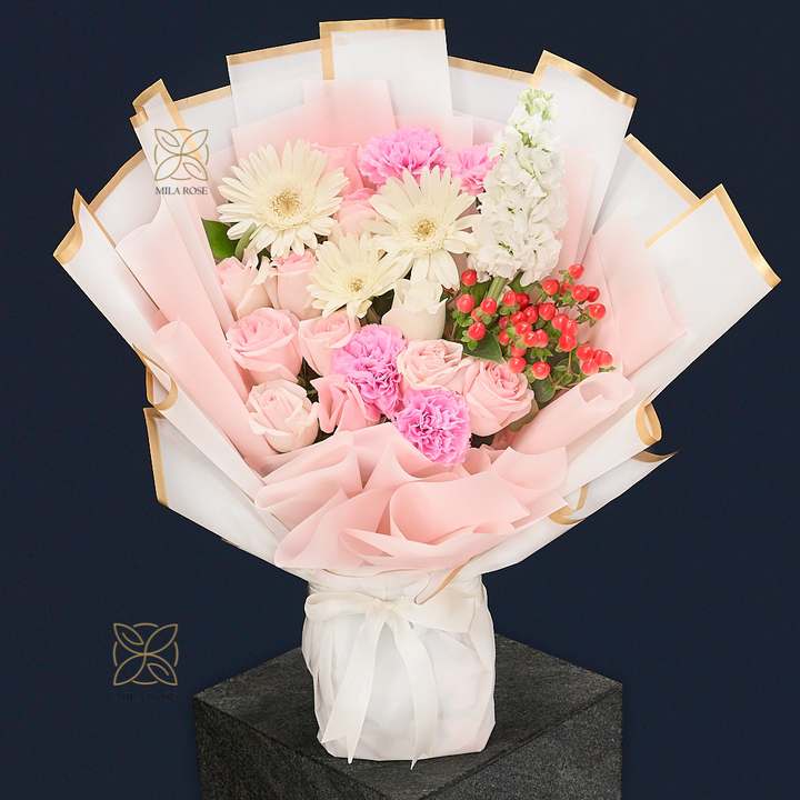 10 Roses, 3 gerbera, 3 Hypericum, 1 matthiola and 4 carnation – luxury design, soft colors, and a smell that makes her smile 🌸