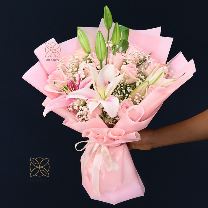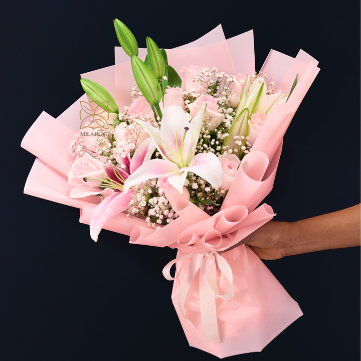 Bring elegance to their day π β a luxurious bouquet with 6 fresh Dutch Lilies +10 roses + 3 Gypso , beautifully wrapped for that perfect touch of style!