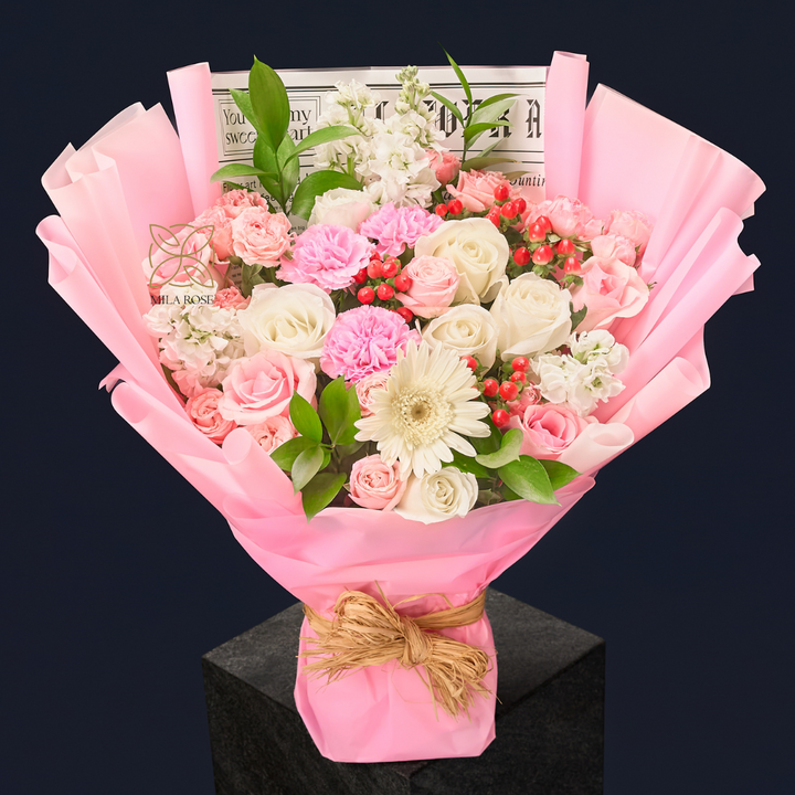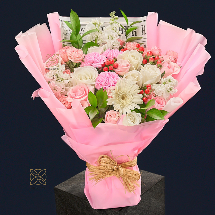 Elegant Pink Bouquet of Roses, Matthiola, Hypericum and Gerbera