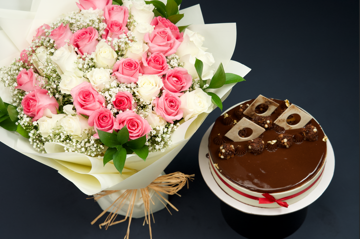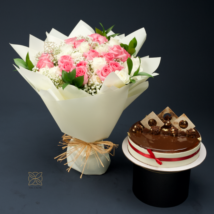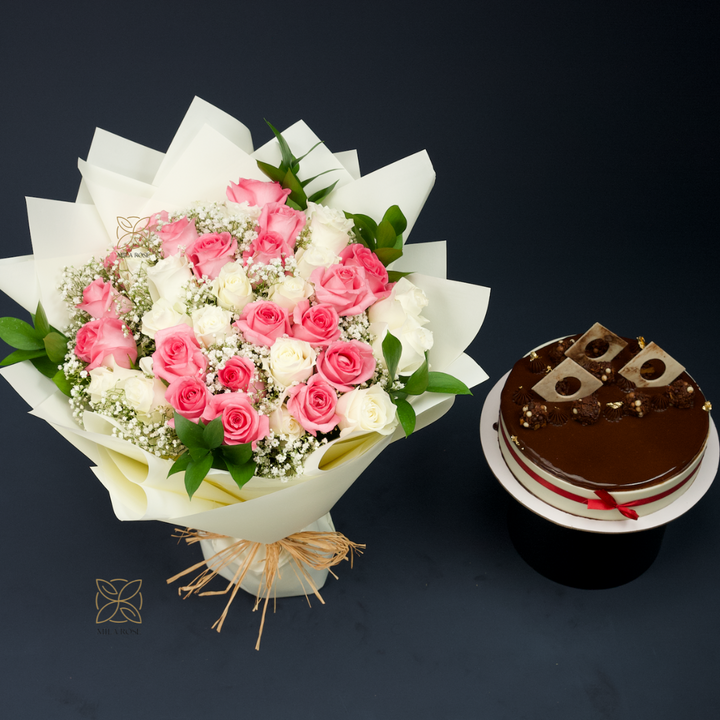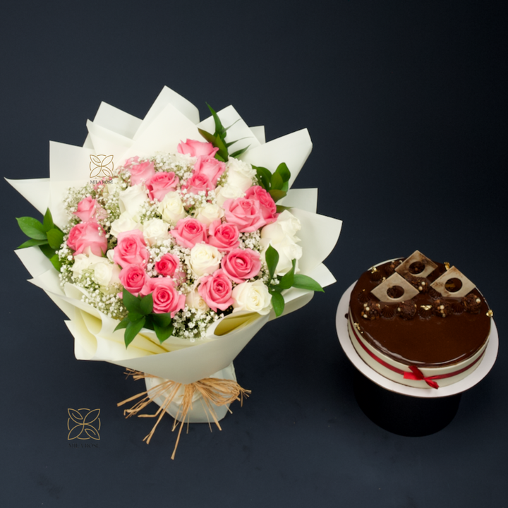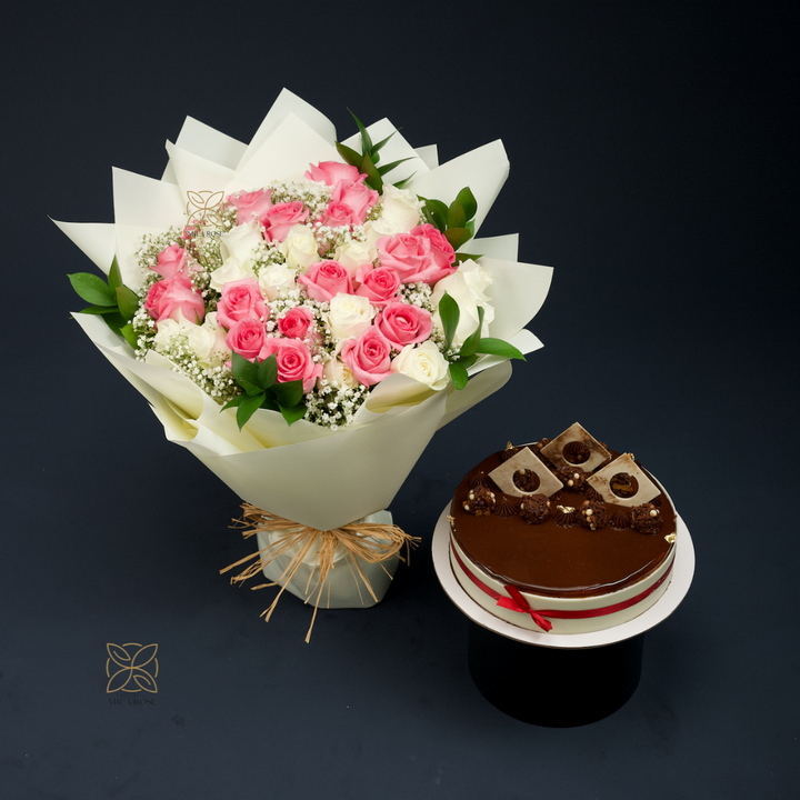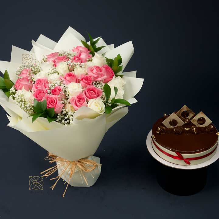 A dreamy bouquet of 33fresh white & pink roses, beautifully mixed with accessories and gypsophila — wrapped in premium elegant packaging.