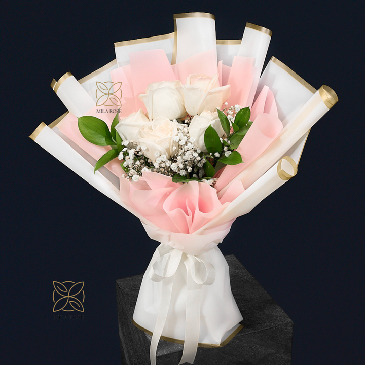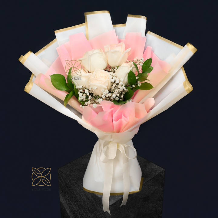 5 Roses, 2 Ruscus and Gypso – luxury design, soft colors, and a smell that makes her smile 🌸