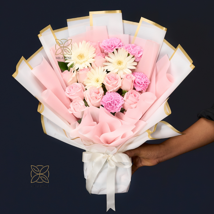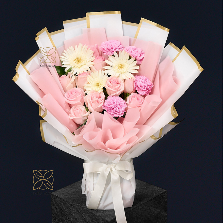 10 Roses, 4 Carnation + 3 Gerbera, 1 Ruscus β luxury design, soft colors, and a smell that makes her smile πΈ