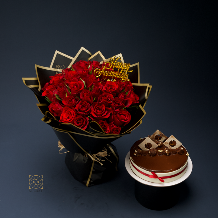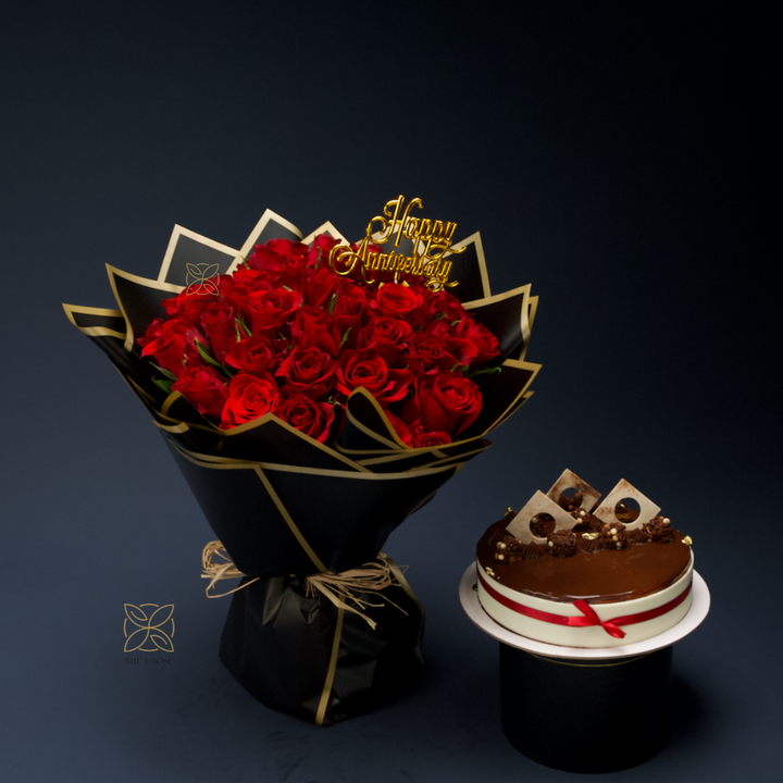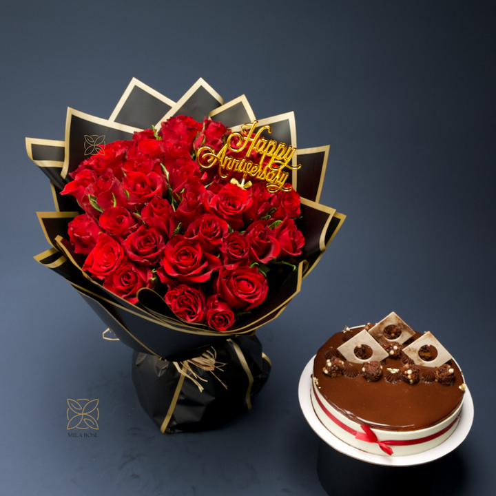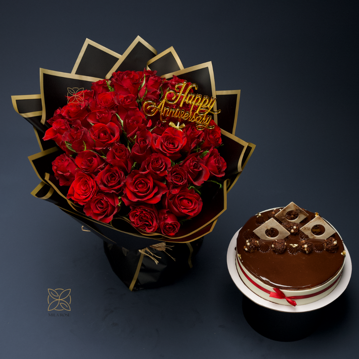 Surprise your loved one with the perfect gift! A stunning circular bouquet of 32 large, luxurious red roses carefully arranged and wrapped in elegant black packaging, paired with a 1kg Ferrero chocolate cake made from the finest ingredients. A memorable experience at an unbeatable price. Show how much you care. Order now and create an unforgettable moment!