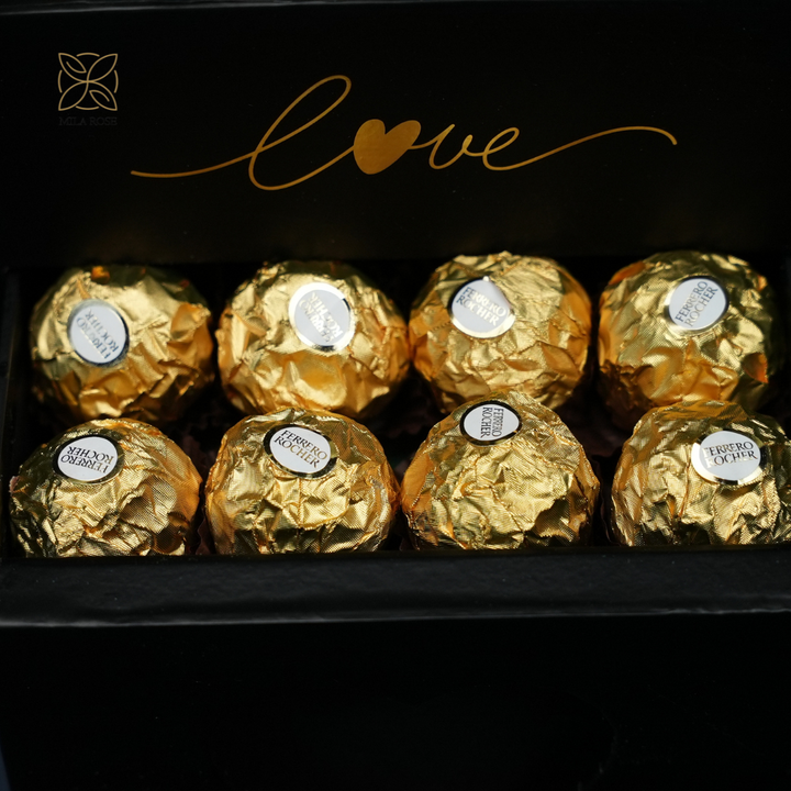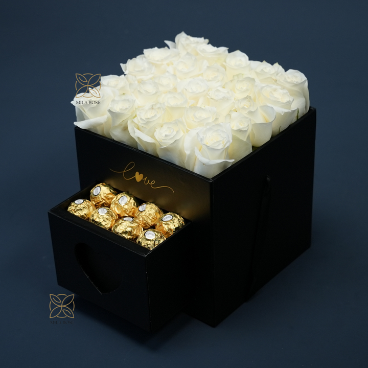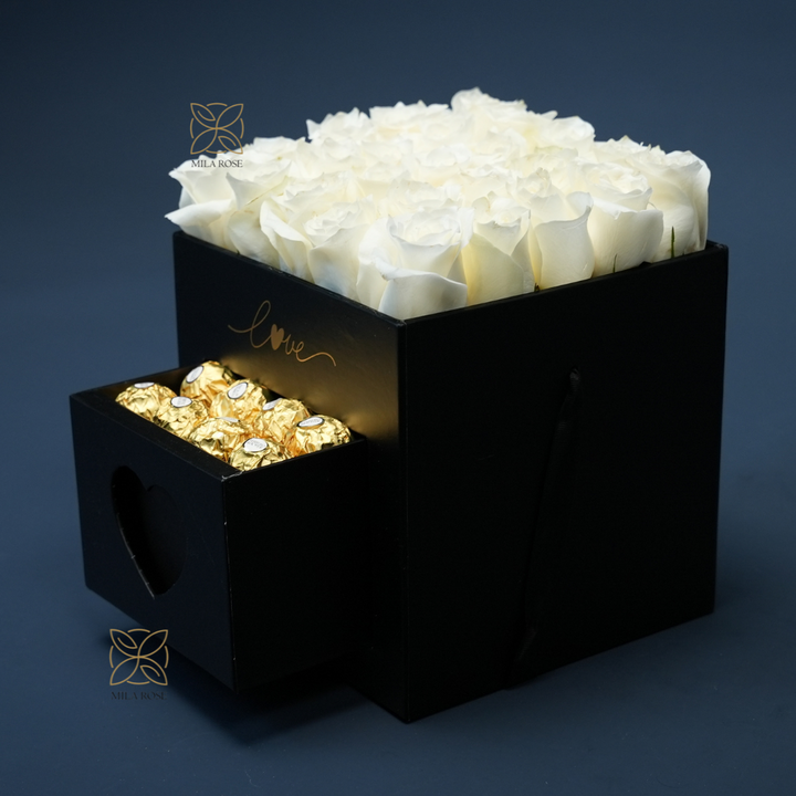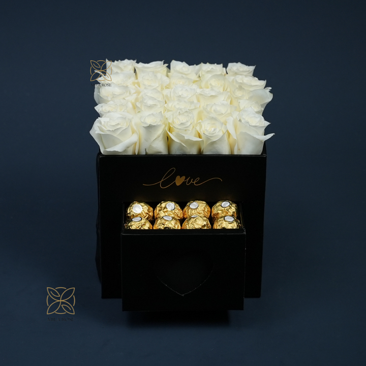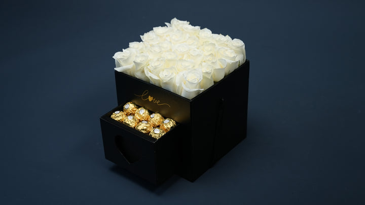 Treat someone special with this elegant 19x19 cm luxury rose box, featuring 16 large white fresh roses and a hidden drawer filled with luxurious Ferrero Rocher chocolates.
